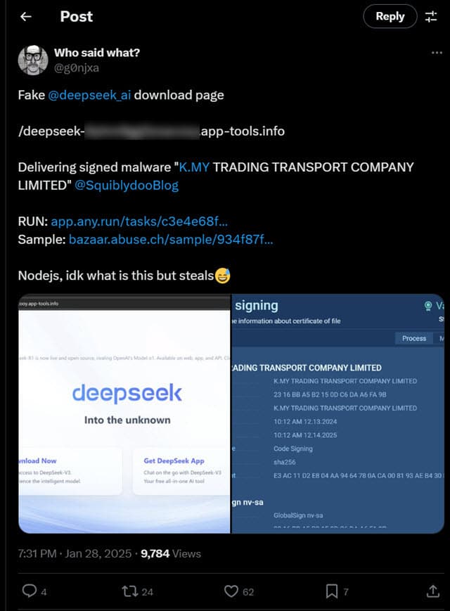En cuanto al sitio apócrifo, según el mismo usuario de X, el dominio de esta URL es usado por otros sitios que se hacen pasar por diversos software para distribuir malware. Este dominio utiliza la firma digital que supuestamente proviene de una empresa llamada «K.MY TRADING TRANSPORT COMPANY LIMITED» para intentar que parezca un archivo legítimo y evitar ser detectado por sistemas de seguridad.