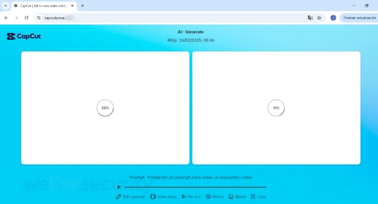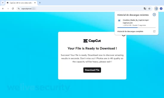 Recientemente, ESET, identificó un sitio falso de CapCut mediante el cual, supuestamente, se podrían crear videos utilizando la IA. Lo cierto es que luego de ingresar el prompt para la creación del video, el sitio simula un proceso y luego ofrece descargar el resultado. Al hacerlo, lo que en realidad descarga es un troyano. Este caso no es aislado, ya que forma parte de una campaña más amplia en la que también se han identificado sitios falsos que suplantan la identidad de otras marcas como Adobe o Canva (Fuente ESET Latam).