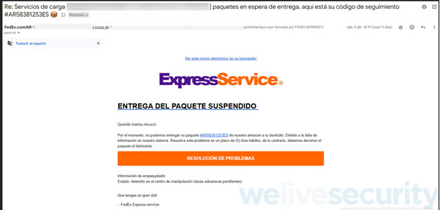 ESET, alerta por una nueva campaña de phishing que utiliza correos electrónicos que imitan al servicio de logística FedEx para engañar a quien los reciba. Los correos usan de excusa para el contacto que hay un paquete retenido en aduana y se debe realizar alguna gestión para destrabar el envío (Fuente ESET Latam).