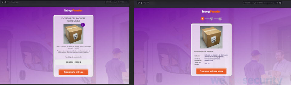 Si la víctima decide continuar, el sitio va guiando una serie de pasos para hacer el pago para recibir el paquete supuestamente retenido. Incluso se programa una supuesta entrega mediante opciones en las sucesivas pantallas que van abriéndose.