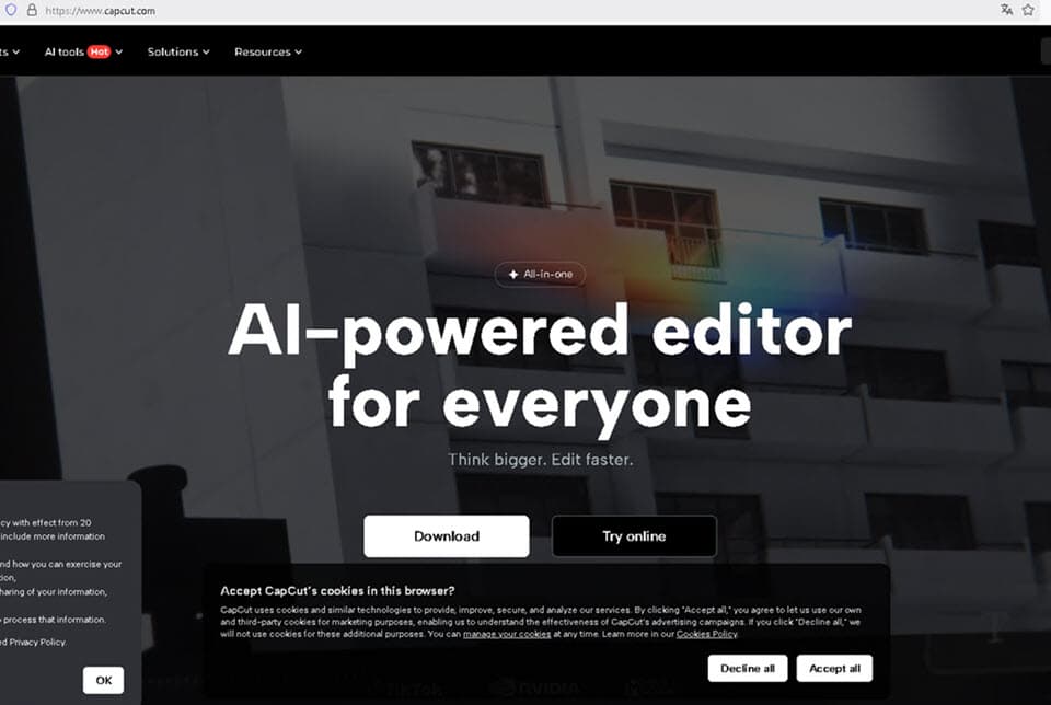 Esta campaña, que fue reportada originalmente a través de X por el usuario DaveTheResearcher, es un ejemplo de sitios falsos cuya URL presenta variaciones imperceptibles con respecto al oficial y que a simple vista parecen legítimos. En el caso de CapCut, el sitio oficial tiene el siguiente dominio www.capcut.com, mientras que la URL de la página falsa agrega la letra i al final de la palabra cut: www.capcuti.com.