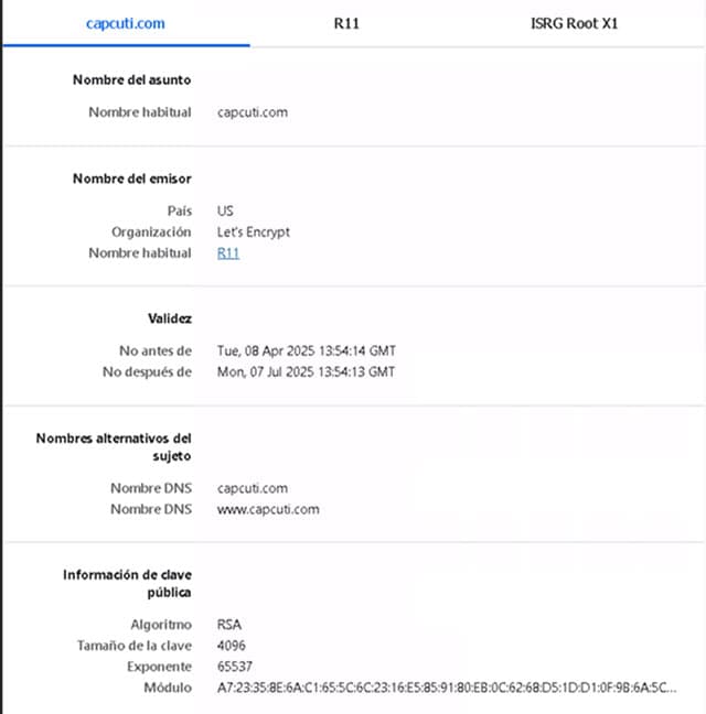 Al analizar el sitio falso, ESET identificó que el certificado utilizado por los cibercriminales para el protocolo HTTPS es válido desde el 08-04-2025 hasta el 07-07-2025. Esta información da una idea de la posible duración de la campaña maliciosa y representa, además, otro indicio para cuestionar la legitimidad del sitio.