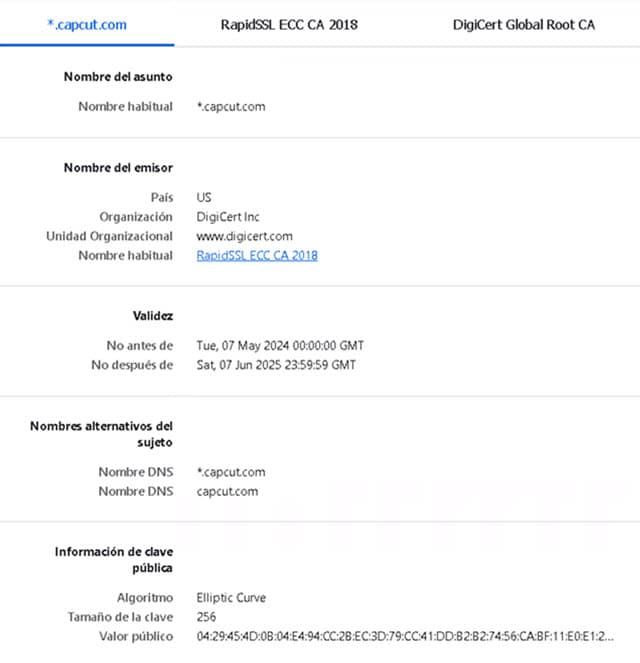 La siguiente captura de pantalla muestra la información del certificado del sitio oficial: