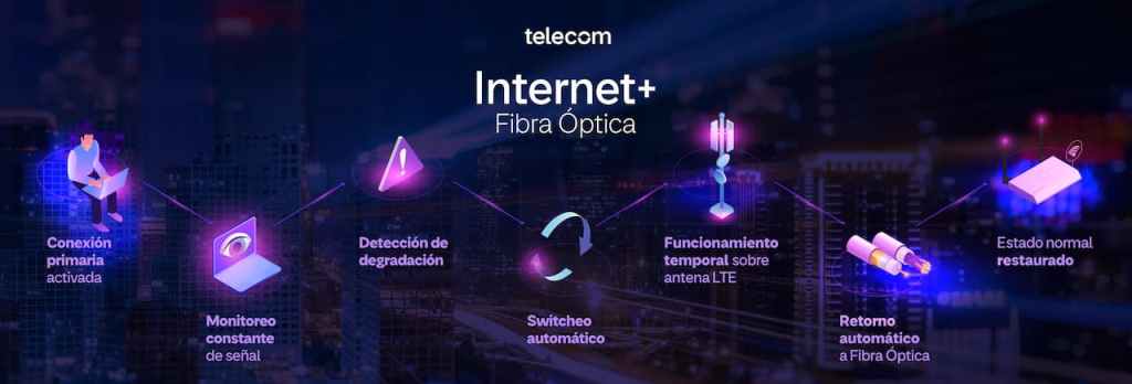 Telecom, a la vanguardia en soluciones tecnológicas para el mercado corporativo, empresas y organismos públicos, presenta la solución Internet+, un servicio diseñado para ofrecer conectividad ininterrumpida entre la red fija y móvil para tener una conexión asegurada en todo momento (Fuente Telecom Argentina).