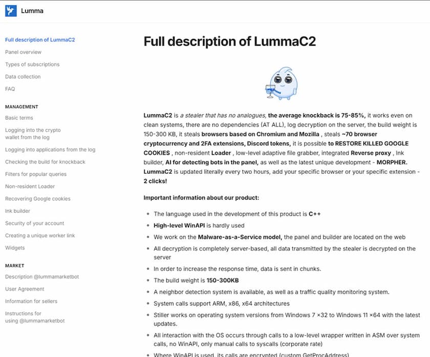LummaStealer: Es una amenaza surgida alrededor del 2022 que evolucionó rápidamente bajo el modelo Malware-As-A-Service. Además de ser el infostealer más detectado por los sistemas de ESET -con más de 4000 detecciones únicas solamente en 2025 en la región-, es de los stealers más vendidos en los mercados clandestinos.