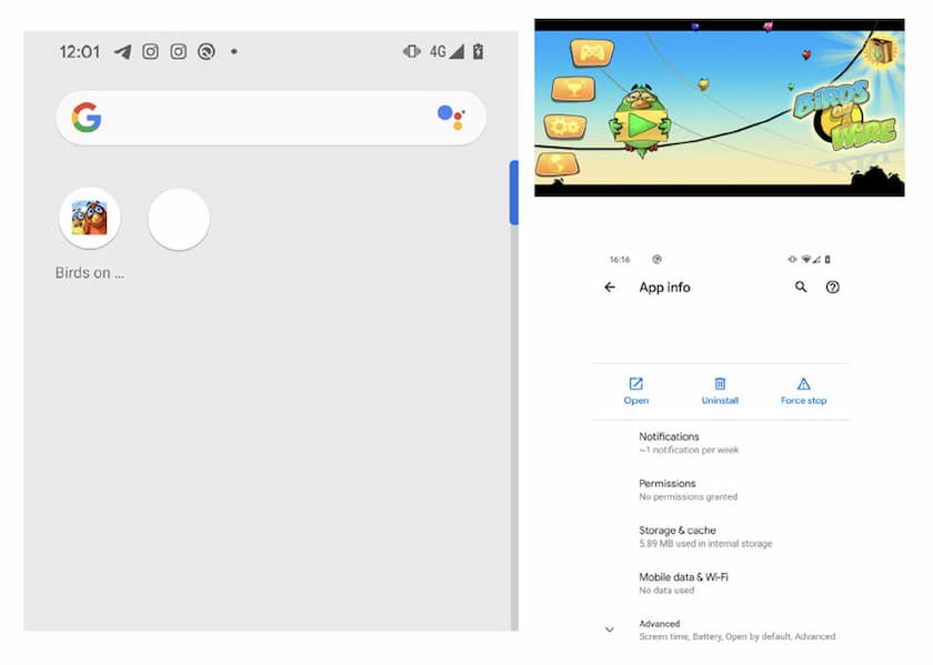 Icono de la app señuelo (Birds on Wire) y, en blanco, el de su gemela. La app legítima lleva al juego (arriba a la izquierda) y el icono gemelo lleva a info de la app (abajo a la izquierda).