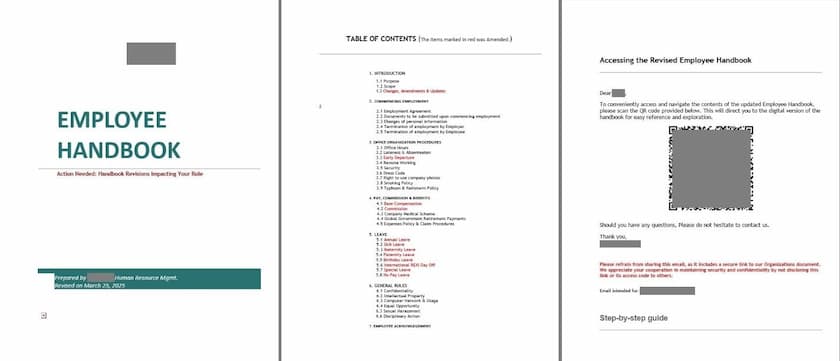 El documento adjunto, que se hace pasar por una versión actualizada del “Manual del Empleado”, no contiene ninguna directriz real: solo incluye una portada, una tabla de contenido con los elementos que supuestamente han sido modificados resaltados en rojo, una página con un código QR (supuestamente para acceder al documento completo) y las instrucciones comunes sobre cómo leer códigos QR con un teléfono. El documento menciona varias veces el nombre de la víctima para hacerle creer que fue creado específicamente para ella.