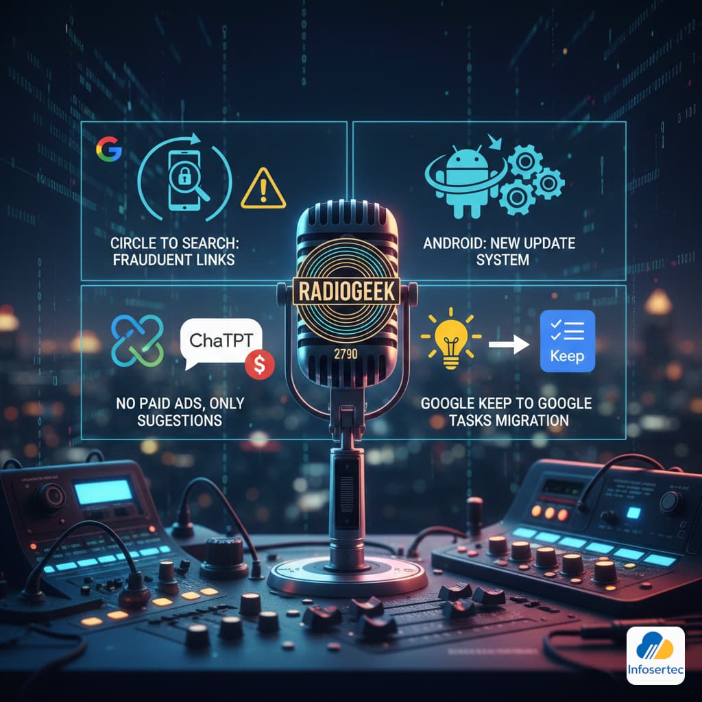 El programa 2790 de Radiogeek, les habló de varios temas importantes. Google hoy confirmo que podemos utilizar Circle to search, para encontrar enlaces fraudulentos, además confirma un nuevo sistema de actualizaciones en Android, por otro lado tenemos que OpenAI, confirma que ChatGPT no tiene publicidad, al menos paga y que solo son sugerencias y por último Google Keep empieza la migración hacia Google task.