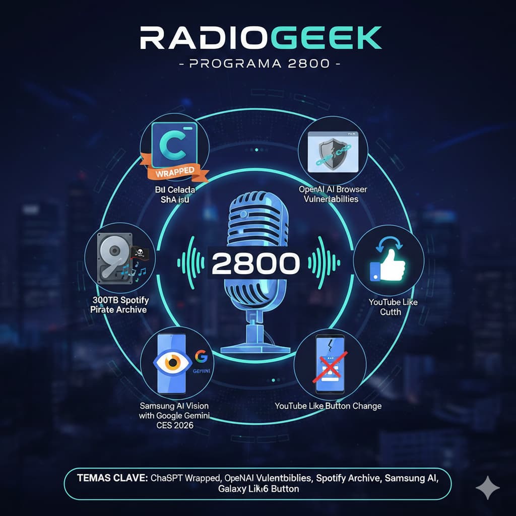 El programa 2800 de Radiogeek, les habló de varios temas importantes. ChatGPT lanza su revisión de fin de año como Spotify Wrapped; OpenAI afirma que los navegadores de IA siempre pueden ser vulnerables a ataques de inyección rápida; Piratas recopilan todo Spotify en un masivo archivo de 300 terabytes; Samsung presentará una visión de IA creada con Google Gemini en el CES 2026; el Galaxy S26 se va retrasar; por último Youtube modifica el botón «me gusta».