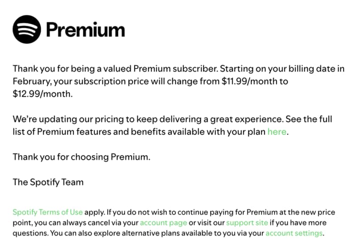 La plataforma de streaming líder en el mundo anunció un nuevo incremento en el costo de sus suscripciones mensuales para los usuarios de Estados Unidos. La compañía justifica este ajuste por la necesidad de seguir invirtiendo en nuevas funciones de inteligencia artificial y la expansión de su catálogo de audiolibros y podcasts (Fuente Spotify).