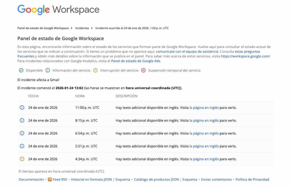Desde las últimas horas, usuarios de Gmail en todo el mundo han reportado problemas críticos en el sistema de clasificación de correos. Una aparente falla en los algoritmos de filtrado está provocando que mensajes importantes sean marcados como spam, mientras que correos basura y de phishing logran colarse en la bandeja de entrada principal (Fuente Panel de Google Workspace).