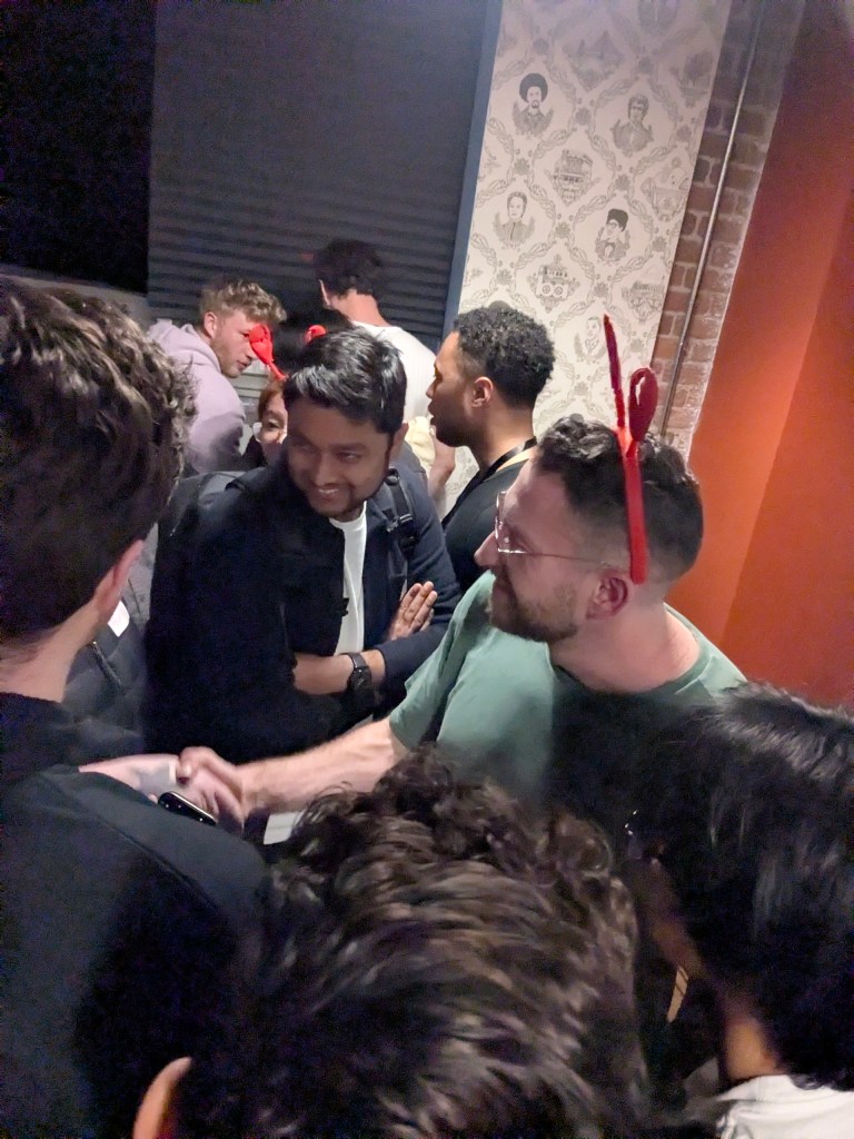 Llego 15 minutos antes. El lugar ya está saturado. Al frente, los técnicos luchan con el feedback de los equipos; al fondo, el catering se despliega como logística de guerra. Hay comida para doscientas personas agolpadas en un espacio diseñado para la mitad. Cajas de pizza grasientas, sopas individuales, hummus, bolsas de snacks varios. Lo de siempre. Pero hay algo distinto: bandejas metálicas sin marcar, selladas. Un misterio térmico en mitad del caos.
