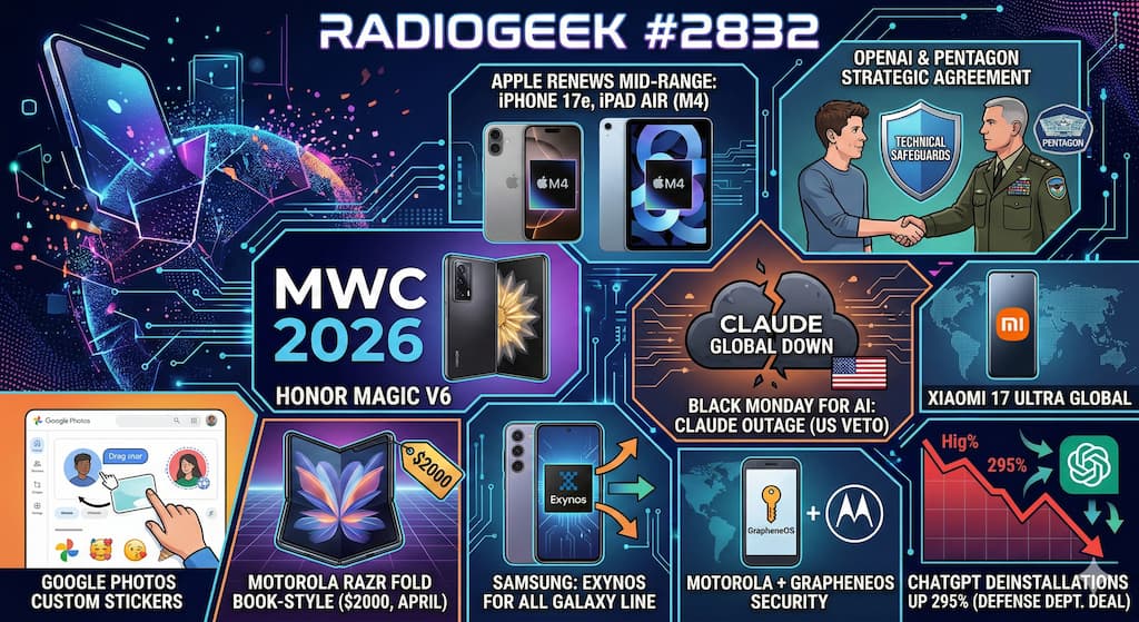 El programa 2832 de Radiogeek, les habló de varios temas importantes. Apple renueva su gama media – Llegan el iPhone 17e y el iPad Air con chip M4; OpenAI se une al Pentágono – Sam Altman anuncia un acuerdo estratégico con «salvaguardas técnicas; #MWC2026 – Nuevo Honor Magic V6 plegable; Google Photos para Android ya permite crear stickers personalizados; Motorola Razr Fold – El primer «Book-Style» de la marca costará 2.000 dólares y llega en abril; Samsung confirma el fin de una era – Exynos llegará a toda la línea Galaxy para recuperar su independencia; Lunes negro para la IA – Claude sufre una caída global tras el veto del gobierno de EE. UU.; Xiaomi 17 Ultra llega al mercado global; Motorola se asocia con GrapheneOS para ofrecer seguridad móvil avanzada; y por último Las desinstalaciones de ChatGPT aumentaron un 295% tras el acuerdo con el Departamento de Defensa.