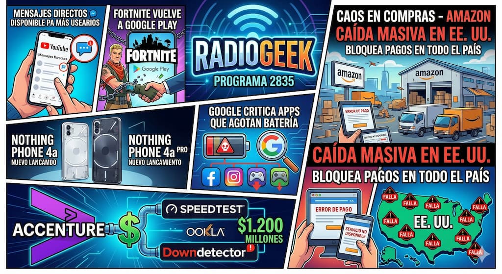 El programa 2835 de Radiogeek, les habló de varios temas importantes. Más usuarios de YouTube ahora pueden probar la mensajería directa en la aplicación; Fortnite vuelve a Google Play tras seis años de conflicto entre Epic y Google; Nothing lanzo nuevos smartphones 4a y 4a Pro; Google comienza a criticar las aplicaciones que agotan la batería del smartphone; Accenture acaba de adquirir Speedtest y DownDetector de Ookla por 1.200 millones de dólares; y por último Caos en las compras – Amazon sufre una caída masiva en EE. UU. y bloquea los pagos en todo el país.
