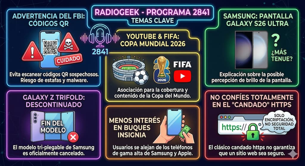 El programa 2841 de Radiogeek, les habló de varios temas importantes. El FBI advierte a los estadounidenses que eviten escanear estos códigos QR; YouTube y la FIFA se asocian para la Copa Mundial de 2026; Samsung responde: ¿Por qué la pantalla del Galaxy S26 Ultra podría verse más tenue?; El Galaxy Z TriFold se descontinúa oficialmente; Los usuarios de teléfonos están despertando del sueño de los buques insignia de Samsung y Apple y por último les hablo de no confiar del todo en el «candidato» o el clásico https de las webs.