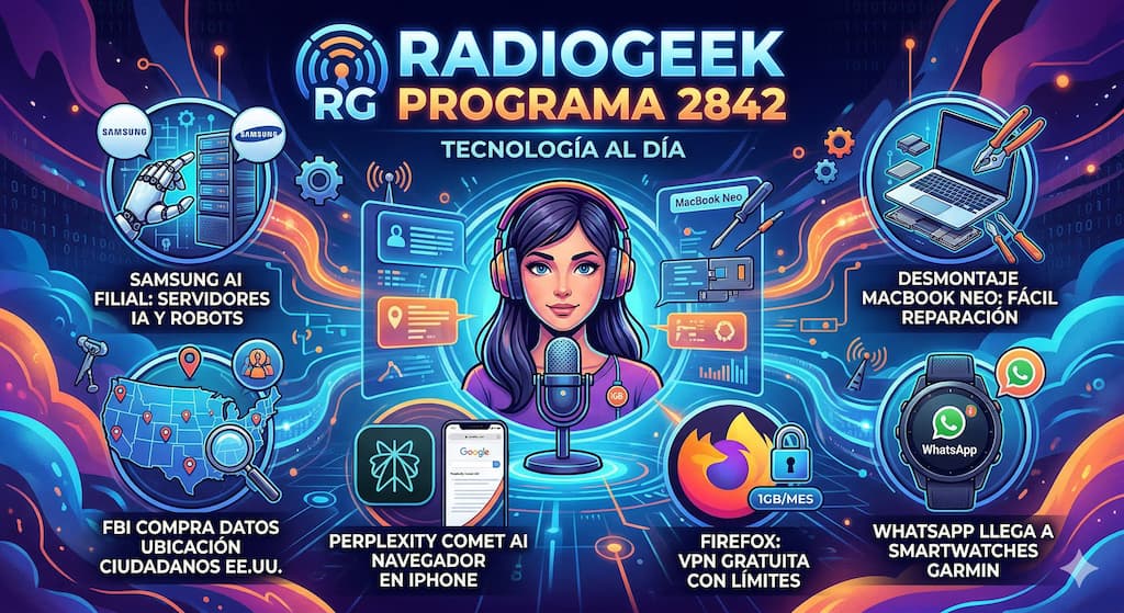 El programa 2842 de Radiogeek, les habló de varios temas importantes. Una filial de Samsung está reestructurando su negocio para centrarse en servidores de IA y robots; El desmontaje del MacBook Neo revela una sorprendente facilidad de reparación; El FBI está comprando datos de ubicación para rastrear a ciudadanos estadounidenses, confirma su director; El navegador Comet AI de Perplexity ya está disponible para el iPhone; Firefox presenta una VPN gratuita con límites de datos y por último WhatsApp llega a los smartwatches Garmin.