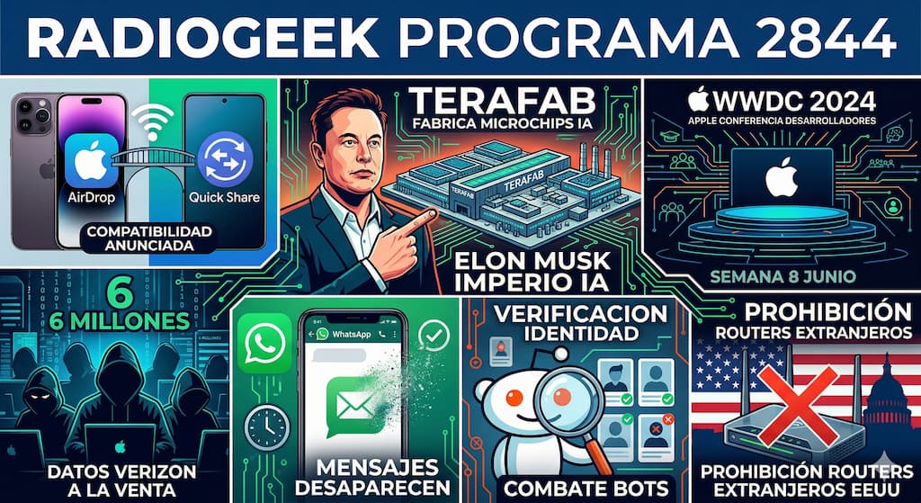 El programa 2844 de Radiogeek, les habló de varios temas importantes. Samsung y Apple rompen el «muro de cristal» y anuncian compatibilidad entre Quick Share y AirDrop; Elon Musk anuncia «Terafab» – La planta de microchips más grande del mundo para alimentar su imperio de IA; La Conferencia Mundial de Desarrolladores de Apple regresa la semana del 8 de junio; Hackers ponen a la venta los datos de 6 millones de clientes de Verizon; WhatsApp trabaja en mensajes que desaparecen automáticamente tras ser leídos; Reddit está evaluando métodos de verificación de identidad para combatir a los bots y por último Estados Unidos acaba de prohibir los routers Wi-Fi de fabricación extranjera