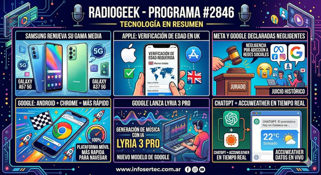 El programa 2846 de Radiogeek, les habló de varios temas importantes. Samsung renueva su gama media – Llegan los nuevos Galaxy A57 5G y Galaxy A37 5G; Apple introduce la verificación de edad para las cuentas de iCloud en el Reino Unido; Un jurado declara negligentes a Meta y Google en un histórico juicio por adicción a las redes sociales; Google afirma que Android con Chrome es «la plataforma móvil más rápida para navegar por internet»; Google lanza el modelo de generación de música Lyria 3 Pro y por último ChatGPT obtiene pronósticos meteorológicos de AccuWeather en tiempo real.