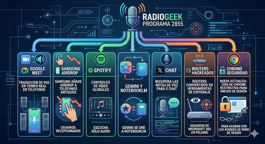 El programa 2855 de Radiogeek, les habló de varios temas importantes. Google Meet finalmente trae la traducción de voz en tiempo real a tu teléfono; Samsung añadió AirDrop a sus teléfonos más antiguos, pero los usuarios decepcionados; Spotify añade controles de vídeo globales para que por fin puedas escuchar solo audio; Gemini se une a NotebookLM; X recupera las notas de voz para X Chat; Los hackers están convirtiendo los routers domésticos en herramientas para espiar a los usuarios de Microsoft 365; y por último La nueva actualización de Chrome restringe el inicio de sesión para acabar con los ataques de robo de sesión.